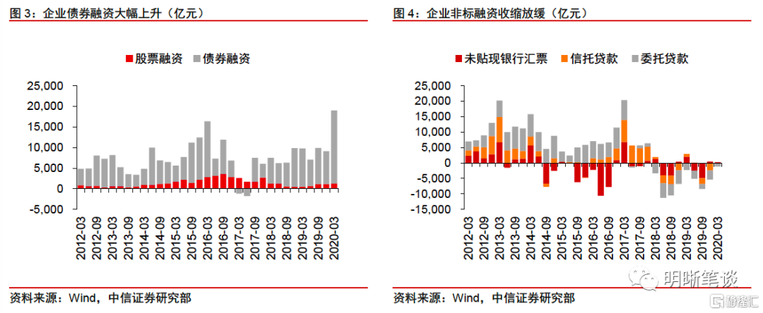 居民部门主要依靠购房贷款。一季度新增居民贷款1.08万亿,个人购房贷款成为主要的支撑项,新增1.21万亿,说明一季度的居民杠杆主要来源于购房贷款的增量。非金融企业部门方面,杠杆大幅扩张主要源于宽松的信贷和债券融资环境。年初以来,央行通过再贷款再贴现等工具给予企业战疫支持,帮助企业复工复产,企业部门一季度通过贷款新增融资6万亿。与此同时,极度宽松的市场流动性使企业发债融资环境大幅改善,一季度非金融企业大量发行债券,净融资1.8万亿。另一方面,非标监管仍未放松,企业非标融资继续收缩,不过降幅明显收窄,并未对企业融资形成太大拖累。