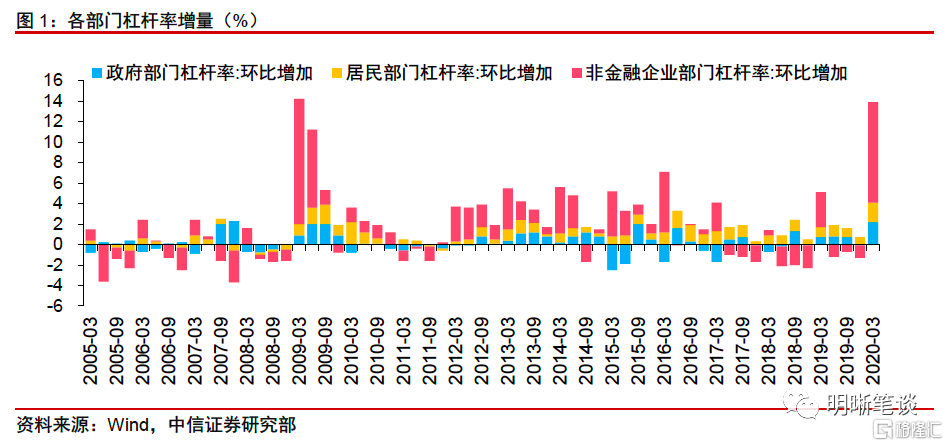 受疫情影响,央行货币投放和银行信贷扩张力度大幅增加,并十分显著地体现在了宏观杠杆率上——社科院公布的一季度实体经济部门杠杆率环比大幅上升,从去年底的245.4%上升到了259.3%,上升了13.9个百分点。宏观杠杆率的跳升主要是哪些因素导致的,全年杠杆率将上升到什么样的水平,未来一段时期内各部门杠杆率的趋势如何,这是本篇报告希望讨论的内容。