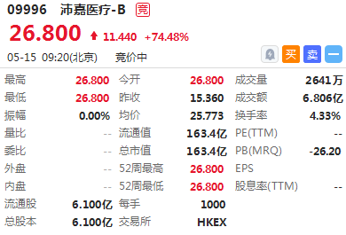 华盛资讯5月15日讯,医疗器械研发商沛嘉医疗-B(09996-HK)首日挂牌,高开74.48%,截至9:23报价26.8港元,最新成交额突破6个亿,总市值为163.4亿港元。在昨日暗盘中该股收报25.3元,较上市价涨64.7%,不计手续费,每手1,000股,账面赚9,940元。