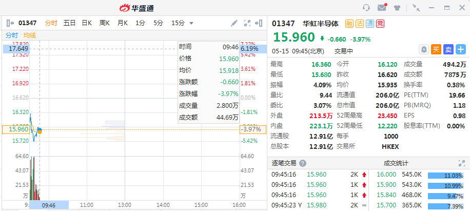 受此影响,华虹半导体今日股价低开3%,并一路走低,一度跌超5%。截止发稿前,暂报15.96港元,跌幅3.97%最新市值为206亿港元。