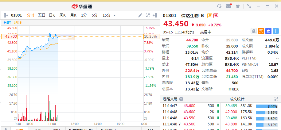 格隆汇5月15日丨信达生物-B(1801.HK)延续近期强势,现报43.45港元,涨幅9.72%,最新总市值583.4亿港元。