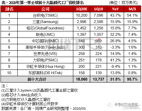 如今,三十年过去了,晶圆代工已经成了半导体业界极其重要的一项业务。根据集邦咨询旗下拓墣产业研究院最新数据分析,2020年第一季前十大晶圆代工厂分别为:台积电、三星、格芯、联电、中芯国际、高塔半导体、世界先进、力积电、华虹半导体以及东部高科。