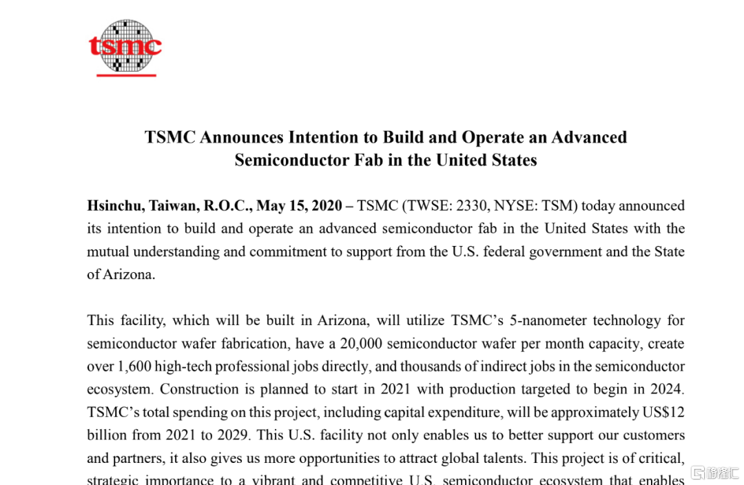 近日,美国欲在本国建晶圆厂的消息频出,起先是有知情人士传出,特朗普政府官员正在与台积电(TSMC)进行谈判 ,以在美国建厂。而据获悉,台积电已经宣布了其在美国的建厂计划。根据台积电的公告,该工厂将生产5nm芯片,规划产能是2万片每月。这将产生超过1600个高科技专业直接工作,以及半导体中的数千个间接工作。根据规划,该工厂将于2021年开始建设,目标是2024年开始生产,在2021到2029年的资本支出将会高达120亿美元。
