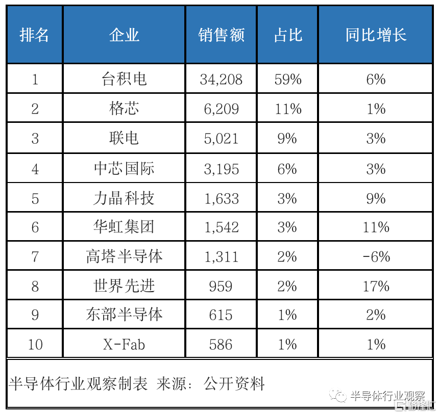 2018 年全球前十大纯晶圆代工厂排名(单位:百万美元)