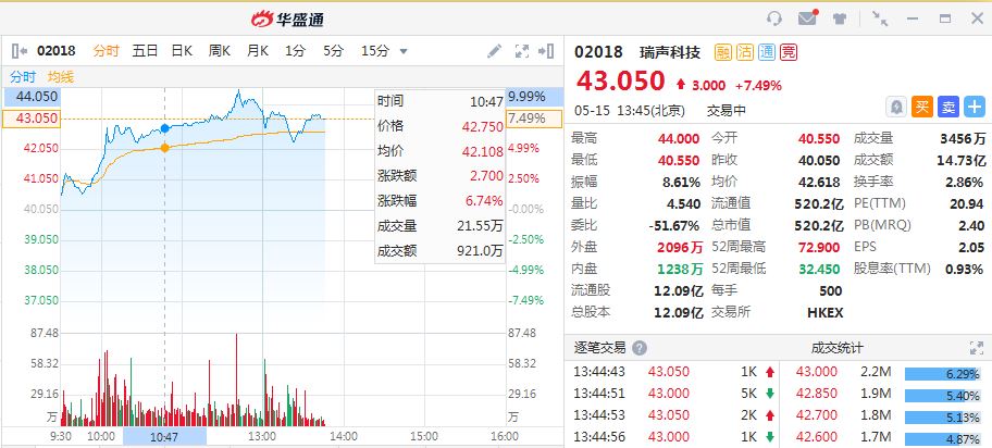 午后,瑞声科技股价仍然坚挺,目前涨7.49%。