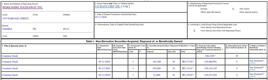 5月14日,SEC文件显示,巴菲特旗下的伯克希尔公司在5月11日-12日出售了近50万股美国合众银行的股票,平均抛售价格为33.04美元。减持后,伯克希尔仍持有美国合众银行1.5亿余股,但持股比例已降至10%以下,意味着接下来的交易无需公开披露。
