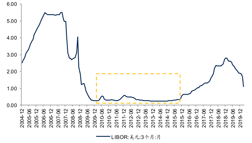 以2008年金融危机时期历史为参考,美国在次贷危机之后为刺激经济,Libor利率大幅下降,在2010~2015年之间处于非常低的水平,直到2015年底美国才开始加息,避免了长期低利率的环境。