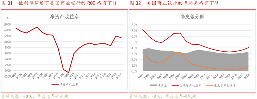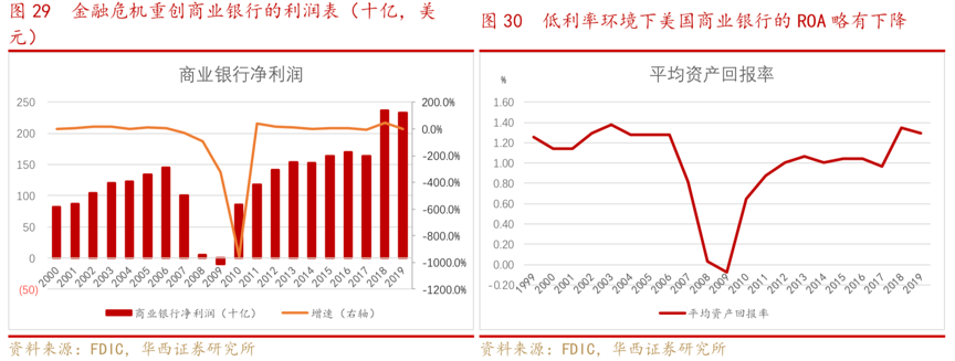 首先是商业银行的利润表遭到重创,2009年商业银行亏损近100亿美元,直到2012年才开始复苏。在低利率时期,美国商业银行ROA也略有下降。