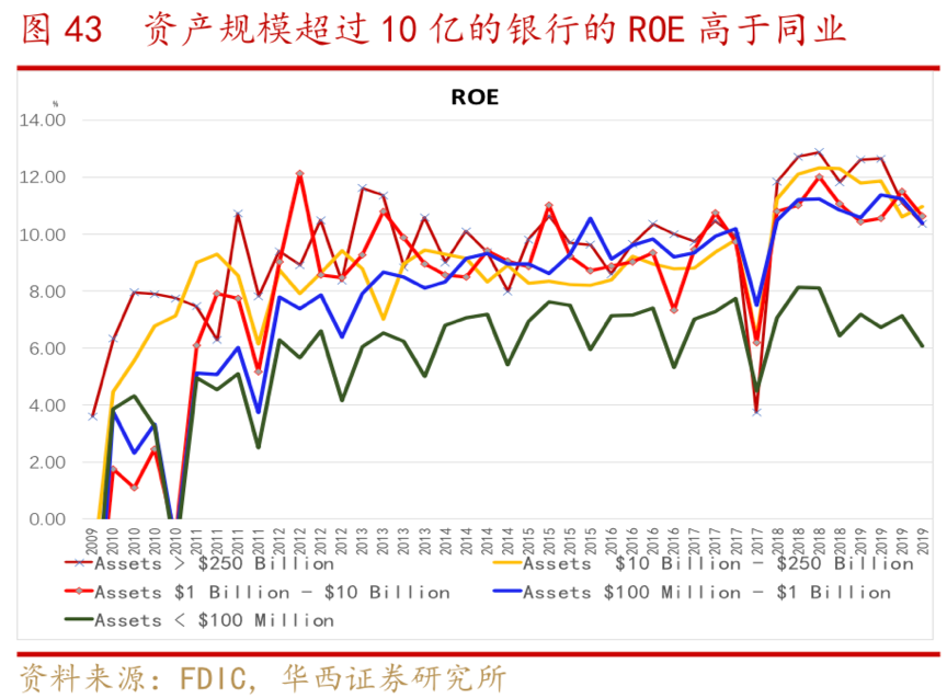 值得注意的是,以过往历史数据来看,大银行在危机期间表现会更加稳定。从盈利能力来看,资产规模超过10亿美元的大型银行ROE、ROA均位于同业高位,原因与非息收入较高和规模效应有关。这或许可以解释巴菲特为何坚持美国合众银行,因为以规模来看,该银行规模也相对较小,或许在危机期间不确定性更大。