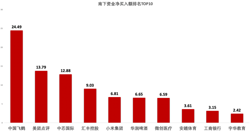 南下资金净买入额排名TOP10中,中国飞鹤排名第一,获净买入达24.49亿港元。该公司本周内受内地“毒奶粉”事件影响,股价剧烈波动,或有大量内地投资者进场抄底。此外,美团点评、中芯国际、汇丰控股、小米集团等热门股票均获大量资金买入。