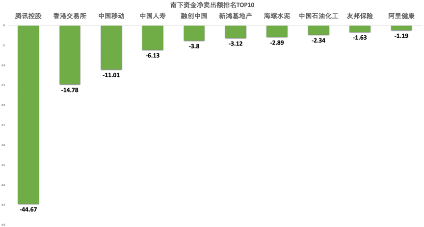 南下资金净卖出额排名TOP10标的中,腾讯控股遭净卖出达44.67亿港元,远远超出其他标的。值得注意的是,腾讯控股本周业绩报告大幅超出市场预期,股价亦创近两年新高,净卖出额较高或与内地资金担忧股价调整而卖出有关。除腾讯外,香港交易所、中国移动、中国人寿等个股亦遭大量卖出。