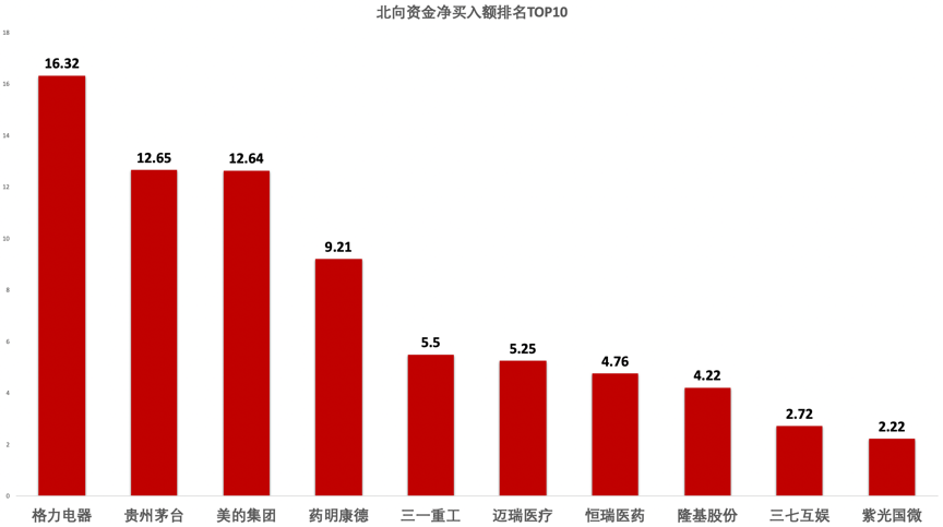 北向资金净买入标的TOP10中,格力电器获净买入达16.32亿元,排名第一。此外,美的集团、贵州茅台等消费股也获得北向资金大额加仓。