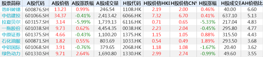 个股方面,洛阳玻璃AH股溢价仍然排名第一。此外,中信建投、拉夏贝尔、一拖股份、中原证券等个股亦存在较大较差,投资者需警惕相关个股风险。