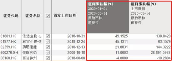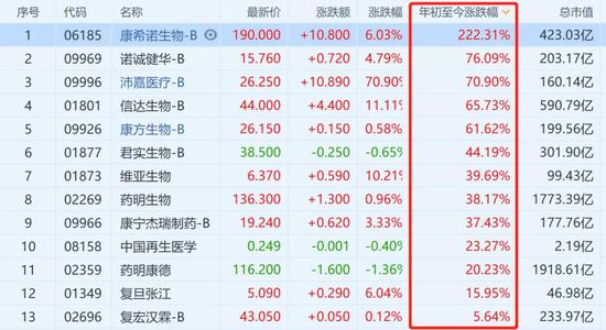 数据显示,年初至今,生物医药板块的康希诺生物、诺诚健华、信达生物和康方生物,分别涨了222.31%、76.09%、70.9%、65.73%和61.62%。