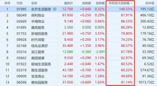 物业板块的永升生活服务、保利物业、中海物业、鑫苑服务和新城悦服务,年初至今已经分别涨了140%、87.91%、86.53%、80.28%和79.8%。