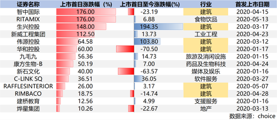 不过,颠覆认知的是,上市首日涨幅最凌厉的公司,它们所处的行业并非物业和医药,而是建筑。