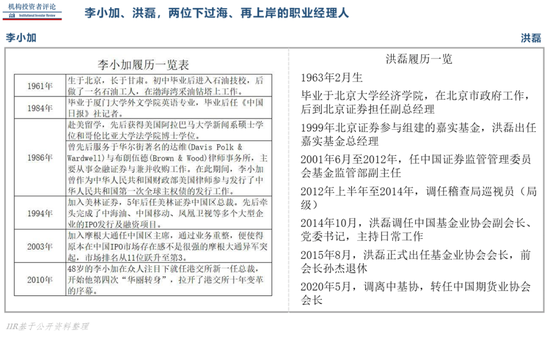 首先,都是下过海(在金融机构从过业,有实践经验)、再上岸的“职业经理人”。李小加媒体、法律、中美,全部跑过遍,洪磊则是从基金行业的运动员,半被动地变为裁判员。