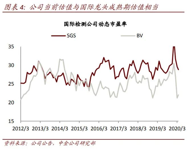 从估值上看,SGS和BV作为国际检测巨头,只有个位数的成长性,但是近几年的PE波动区间在20-35倍之间,20倍PE就是估值的底部了。那么,国检对标国际检测巨头,依然处于发展的初期,成长速度要快于国际巨头,那么在成长的初期,给到30PE是合理估值。