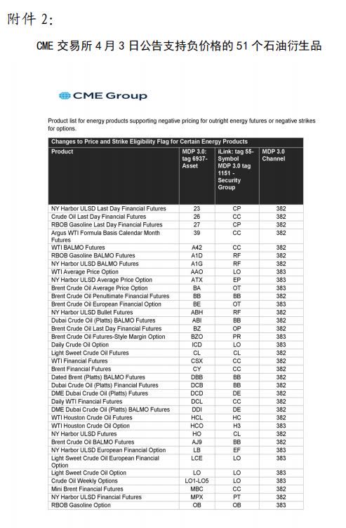 美国对期货市场创新一直秉持开放包容的监管环境。2000年《商品期货现代化法案》给予交易所更多创新权限。CFTC的监管理念是,在符合《商品交易法》和CFTC规章制度下,监管应保持前瞻性思维和创新意识,市场应遵循“风险自担”投资原则。例如,2017年12月,在虚拟货币法律地位尚不明确、相关监管还在探索、SEC持有完全否定态度的情况下,CME等三家交易所通过自证程序上市了比特币期货,受到市场较大争议。但CFTC对此坚定支持,认为比特币期货是合规框架下的市场创新。鉴于此,我们判断,一是CFTC的事后介入将更多关注此次事件中的内幕交易、市场操纵等违法行为,而不会“叫停”交易所支持负定价。二是未来或有更多交易所支持负定价。如ICE交易所已宣布将修改某些石油合约定价模式,支持负价格。CME也可能将4月3日公告中支持负价格的51个石油衍生品(附件 2)扩大到其他商品类别,如市场广泛猜测的天然气等。