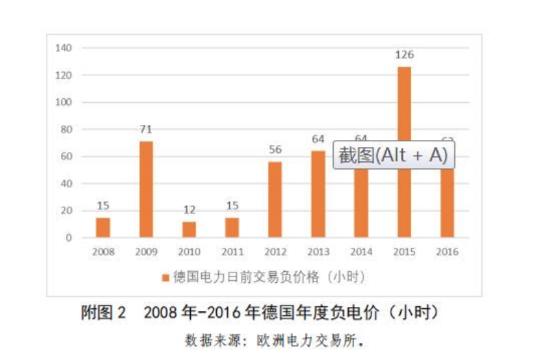 负电价的产生原因主要是短时间供过于求、且供应调节难度较大。常规电源中除了燃气机组可以灵活启停外,煤电、核电的启停和调节成本代价高、速度慢,且技术存在瓶颈。当自然环境适宜时,风力、太阳能等发电量大幅增加,导致市场供过于求。煤电为了避免启停导致的经济损失,只要负电价代价比启停代价低,一般选择倒贴钱以获得继续发电的权利。以德国为例,德国在过去20年大力推动清洁能源,2018年可再生能源占公共用电量比例为40.4%,首次超过煤炭发电占比38%。据欧洲电力交易所数据,近十年以来,德国每年均出现数十个小时的负电价情况(附图 2)。2019年10月,德国负电价曾持续近31个小时,每千度批发电价需要倒贴消费者98美元。