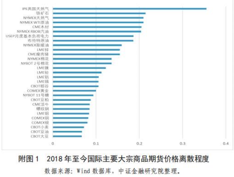 出现负价格的商品一般其价格波动也较大。以2018年至今全球主要大宗商品期货价格的离散程度来看,排名前十名中,天然气、电力、石油的相关品种占据了七个,与出现负价格的商品品种高度重叠(附图 1)。