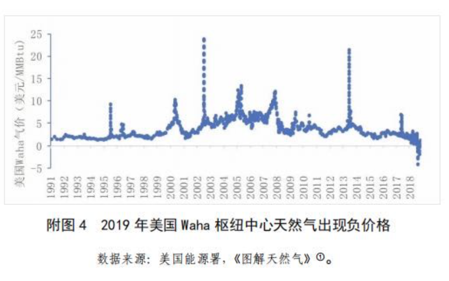 天然气负价格最早出现在美国。美国是全球天然气产量最大的国家,由于压裂和水平钻井技术不断进步,市场出现供过于求。与原油全球定价不同,天然气受到运输限制,不具备全球流通的能力,主要采用区域性定价。2019年3月28日,美国西德克萨斯州的瓦哈(Waha)枢纽天然气价格跌至负值,为历史首次(附图 4),生产商需要支付费用请买家运走天然气。4月3日,瓦哈天然气价格进一步跌至-5.75美元/百万英热单位,比美国天然气基准亨利中心价格低8.42美元/百万英热单位。2020年3月初,瓦哈天然气价格再度跌到-0.5美元/百万英热单位以下,为今年来的首次。