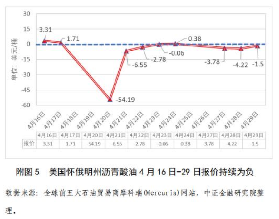 4月20日WTI原油期货2005合约达到-37.63美元结算价,是受到供需失衡、存储能力不足、临近交割日、交易规则修改、空逼多等多重因素下的极端值,并非真实价格水平。但现货方面,3月份美国、加拿大等重质油井口已经出现负的现货油价。重质原油生产设备相比轻质和中质原油的启停难度更大,存储和运输成本更高。3月18日,美国怀俄明州沥青酸油出现-19 美分/桶的报价,生产商支付费用请人运走以减少储量,是全球第一个出现负价格的原油报价。截至4月29日,美国、加拿大等地重油报价仍持续为负,基本在-5美元/桶以内。但在4月20日,现货石油确实出现了历史最低值,怀俄明州沥青酸油4月20日报价最低至-54.19美元/桶,比 WTI2005 合约结算价还要低16.56美元/桶(附图 5)。