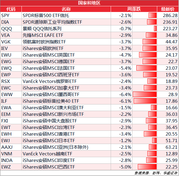 各国家和地区ETF一律下跌,墨西哥和标普拉美40最近几周波动都较大,上周领跌,分别跌6.4%和6.1%。