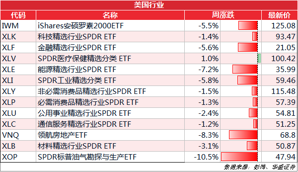 从行业来看,医疗保健行业是所列行业ETF中唯一上涨的,而油气勘探与生产、房地产和能源精选是下跌幅度最大的3只ETF。而事实上,上周油价上涨,主要原油ETF也录得上涨,XOP的下跌一定程度上也是近来累积涨幅过大。
