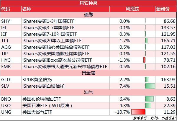 上周白银表现惊人,大涨7.4%领涨,而美油、布油ETF也分别涨了4.3%和6.4%,天然气最惨,下跌超10%。