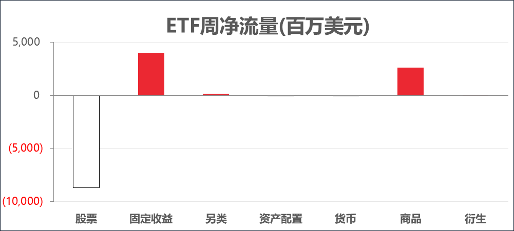 上周股票类ETF净流出幅度继续扩大,超87亿美元逃出股票类ETF,已是连续第4周流出;固定收益类流入减少,商品类流入扩大。