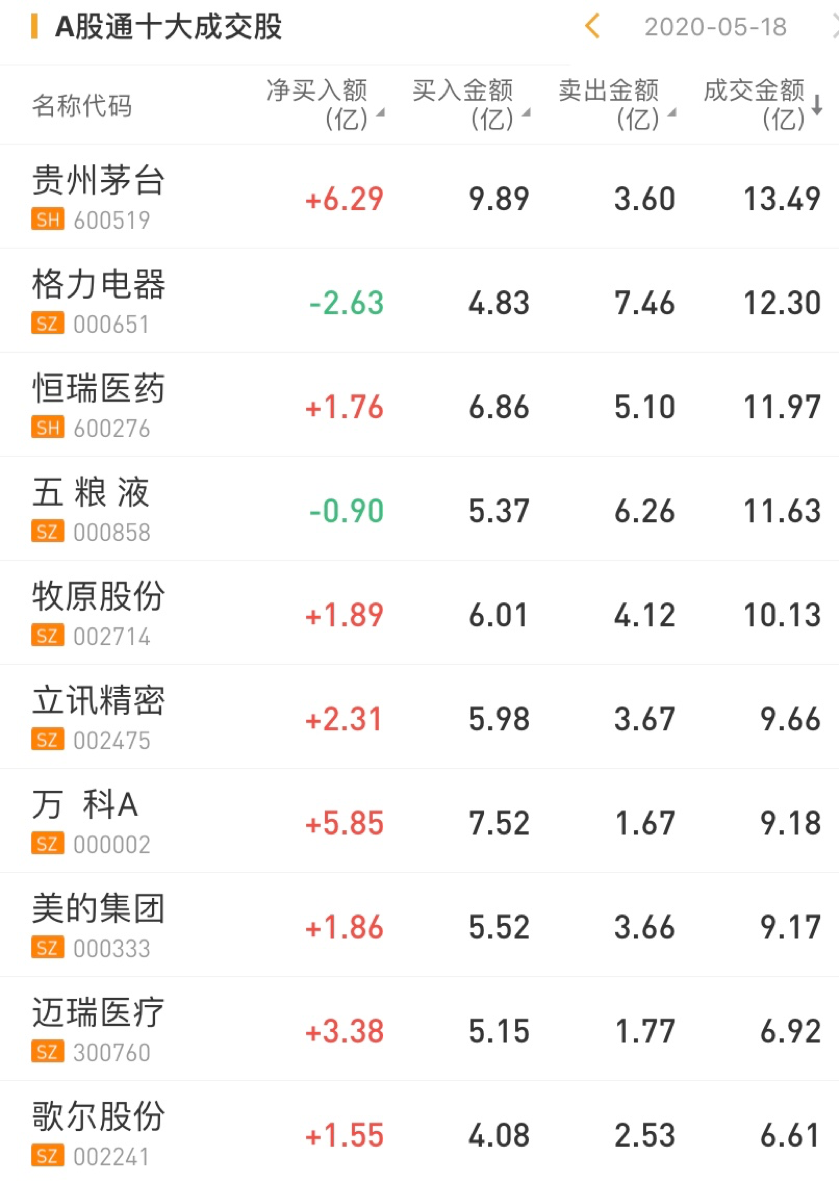 今日,北上资金净买入贵州茅台6.29亿元,净买入恒瑞医药1.76亿元,净买入牧原股份1.89亿元,净买入立讯精密2.31亿元。