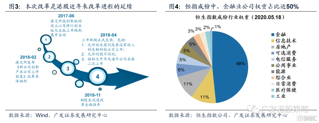 但另一方面,由于选股规则的限制,港股市场最具代表性的恒生指数、恒生国企指数无法纳入新规上市公司。以恒生指数成份构成为例,恒指成份中,金融行业公司权重占比接近50%,而代表“新经济”的信息技术、医疗保健、可选消费等行业累计占比不到20%。因此本次选股规则的调整也是前期港股市场改革进程的延续,以更充分地反映港股改革的成果。