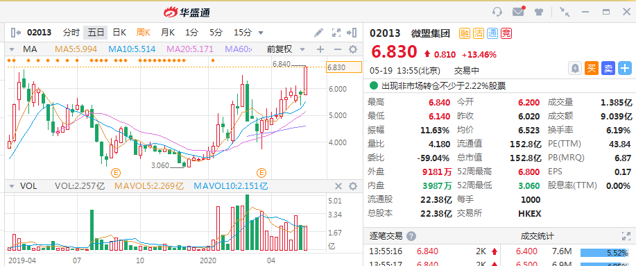 新浪港股讯 5月19日消息,微盟集团股价走高,午后涨幅扩大至13%,报价6.83港元,创历史新高,最新市值152亿港元。