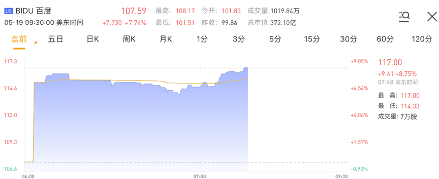 华盛资讯5月19日讯,受财报超预期及回购利好,百度(BIDU)盘前股价一度涨近9%。截至发稿,百度盘前股价涨8.75%,报117美元,当前成交量为7万股。