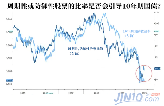 一直以来,“周期性股票/防御性股票比率”是债市的晴雨表。目前来看,美国国债收益率不断下跌,与正在回升的“周期性股票/防御性股票比率”背离。