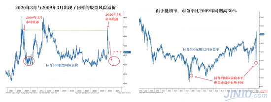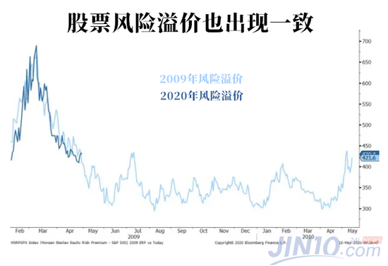 “这不仅仅意味着标普500指数可以直接与2009年的数据进行直接对比,更意味着历史行情可以作为参考,这让我们知道接下来的衰退会发生什么。同时,由于股票风险溢价几乎表现出和2009年相似的走势。因此我们可以更坚定地认为,在金融活动萎缩的时候,这次与之前并没有什么不同。”