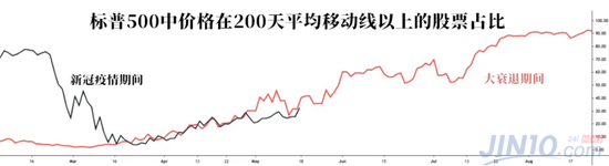 他对比了近期在200日移动平均线以上交易的股票在股市中的占比与2009年同期的占比水平,发现两者比重存在极高的相似性。