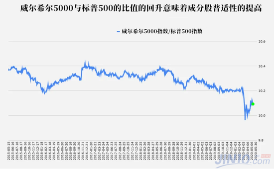如上图所示,威尔希尔5000指数成分股和标普500指数的比值在走低,显示威尔希尔5000指数的表现甚至优于标普500指数。