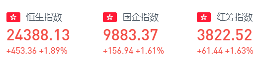 恒生指数开盘涨2.32%,全天维持窄幅震荡。截至收盘,恒生指数涨453.36点或1.89%,报24388.13点,全日成交额达1259.63亿。国企指数涨1.61%,报9883.37点,红筹指数涨1.63%,报3822.52点。