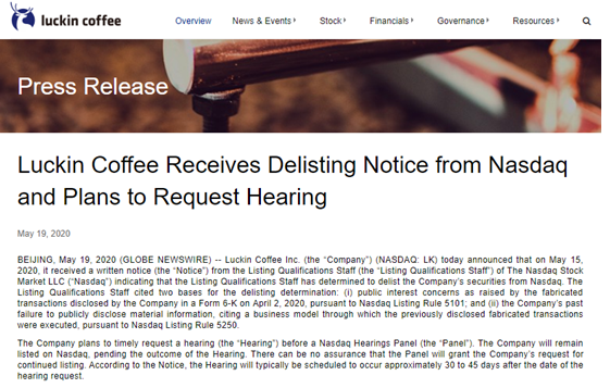 瑞幸遭强制退市,计划举行听证会