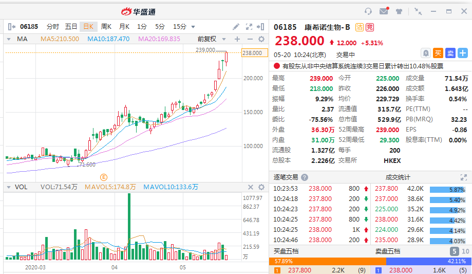 格隆汇5月20日丨康希诺生物-B(6185.HK)今日盘中高见239港元再创上市新高,今年迄今已累涨3倍,现报238港元,涨5.31%,暂成交1.4亿港元,最新总市值529.9亿港元。