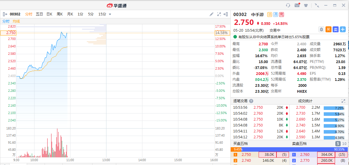 格隆汇5月20日丨中手游(0302.HK)昨日曾创下历史新低,今大幅反弹14.58%,报2.75港元,暂成交7823万港元,最新总市值64.1亿港元。