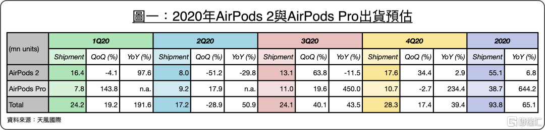 AirPods出货量、AirPods 2在2H20强劲增长之受益者
