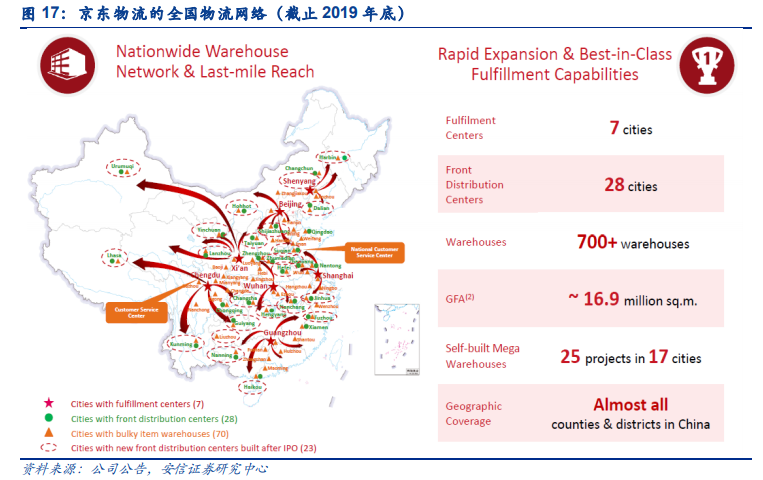 京东物流拥有行业内面积最大、智能化水平领先的仓储网络。京东物流大件和中小件网络已实现大陆行政区县几乎 100%覆盖,88%区县可以实现 24 小时达,自营配送服务覆盖了全国 99%的人口,超 90%自营订单可以在 24 小时内送达。