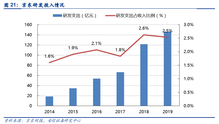 京东研发投入保持连续上升,2019 年研发费用达 146 亿元,近两年的研发投入占收入比例约 2.5%。持续的科技投入为公司不断提升效率。