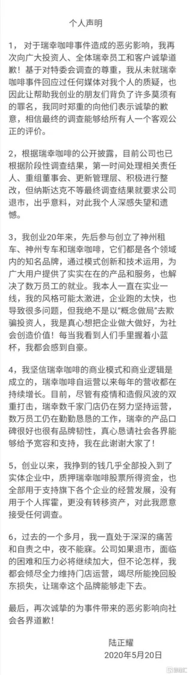 针对瑞幸被纳斯达克要求退市的消息,瑞幸咖啡董事长陆正耀于5月20日凌晨发布声明称,陆正耀在声明中,首先对于瑞幸咖啡事件造成的恶劣影响,向投资人、全体瑞幸员工和客户道歉。不过他认为,瑞幸已根据阶段性调查结果,第一时间处理相关责任人、重组董事会、更新管理层、积极进行整改,但纳斯达克不等最终调查结果就要求公司退市,出乎意料,对此个人深感失望和遗憾。