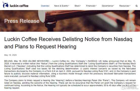 瑞幸咖啡发布公告回应表示,在5月15日收到纳斯达克交易所的退市通知,公司计划就此举行听证会,在听证会结果出炉前,瑞幸将继续在纳斯达克上市,听证会通常安排在听证请求日期后的30至45天举行。据媒体报道,瑞幸也已为可能的退市和后续运营做准备,包括停止扩张,安抚员工。