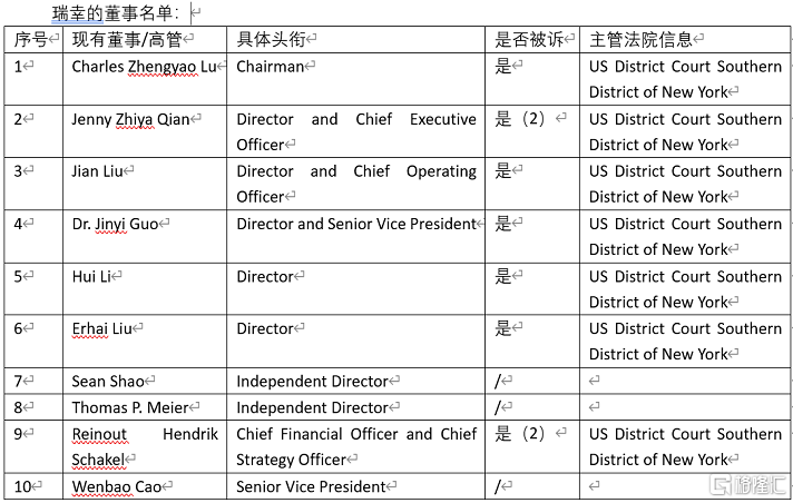 瑞幸董事被起诉名单(图源:锦天城律师事务所)