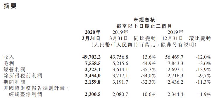 2020年第一季度,总收入达到人民币497亿元,同比增 长13.6%;经调整净利润达到人民币23亿元,同比增长10.6%。